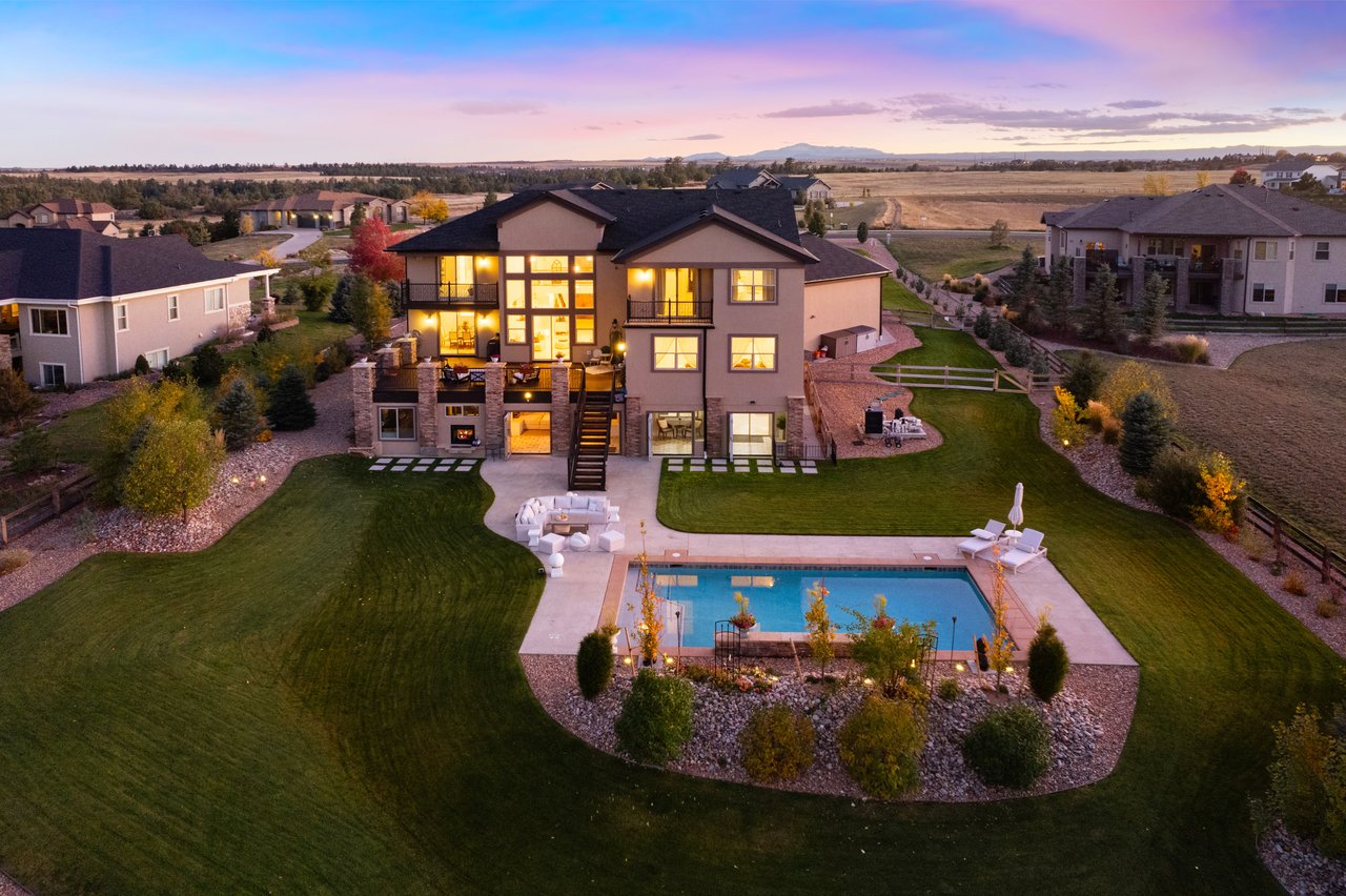Refined yet relaxed, this Castlewood Ranch home lives like a private resort, highlighted by a shimmering heated saltwater pool with waterfalls and sun shelf, backed by beautiful open space, and set on a quiet cul-de-sac. Mature landscaping and distant mountain views enhance the sense of privacy and calm. A fully enclosed all-seasons sunroom with a state-of-the-art kitchen, hot tub, heated floors, see-through fireplace, and four folding glass doors opens to the pool deck, creating the ultimate backdrop for gatherings.